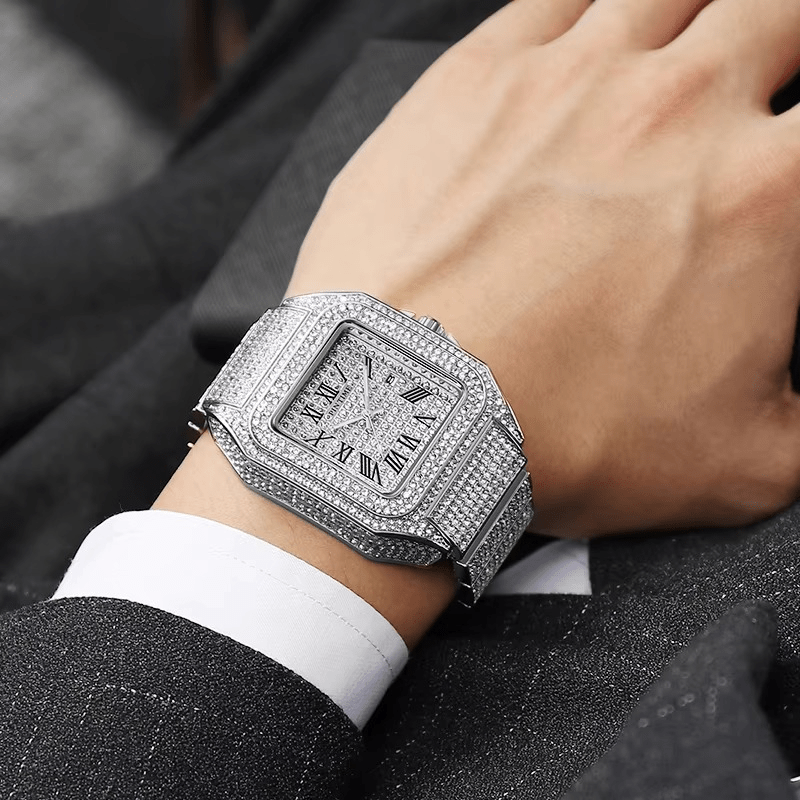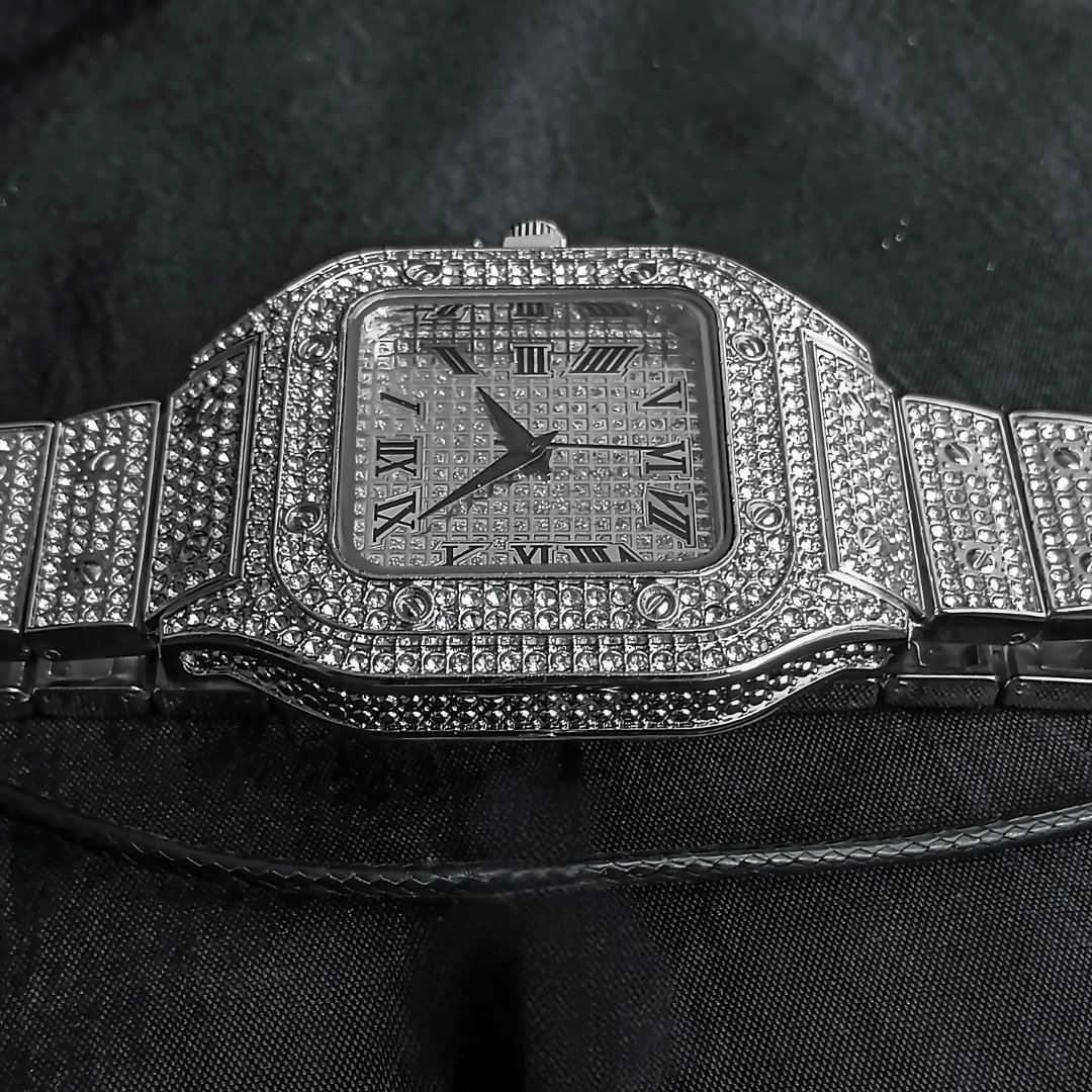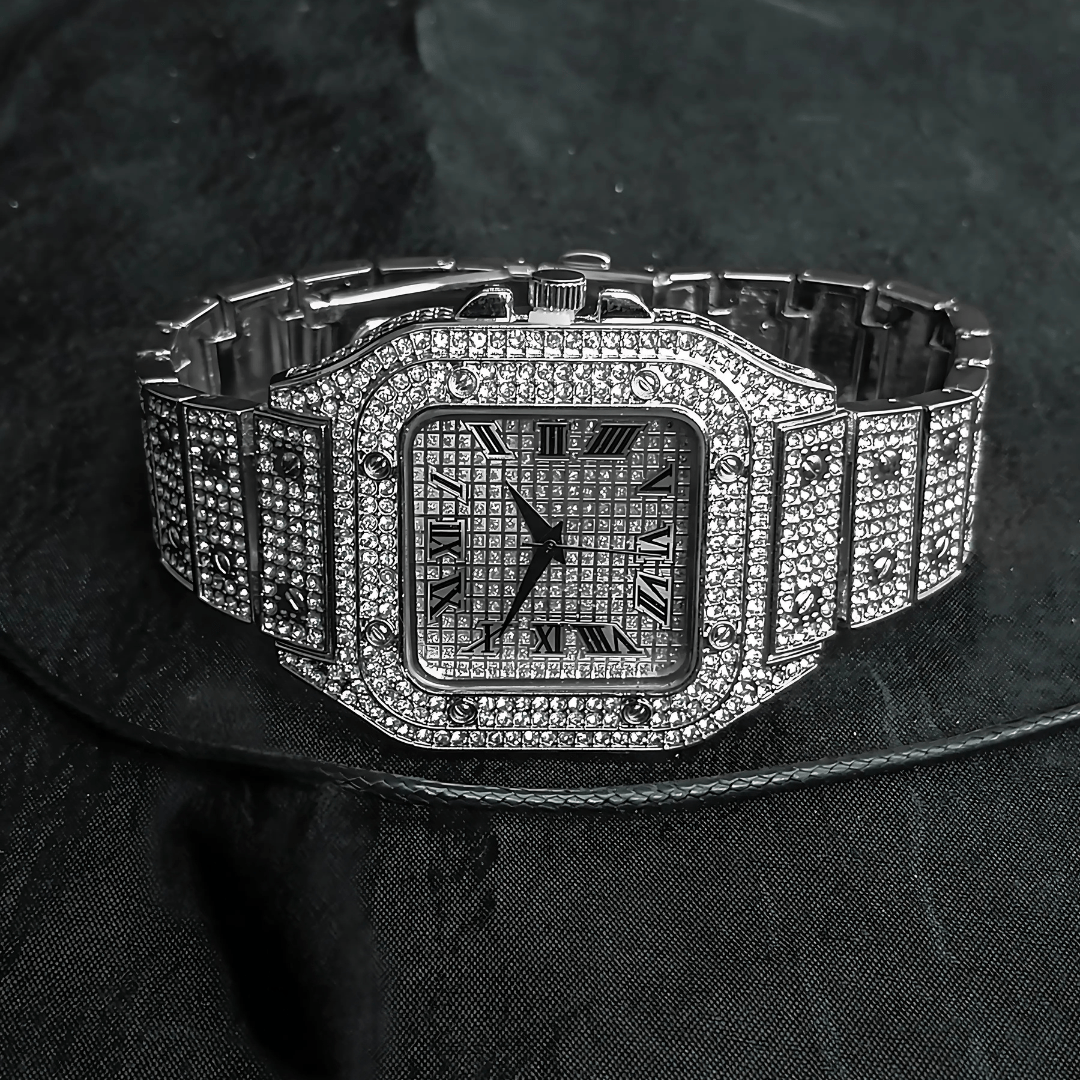 ✅ Stylish & Modern Design: The CARTIER Quartz Wristwatch features a sleek square dial with a hip-hop iced-out aesthetic, perfect for fashion-forward individuals.